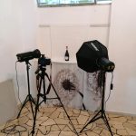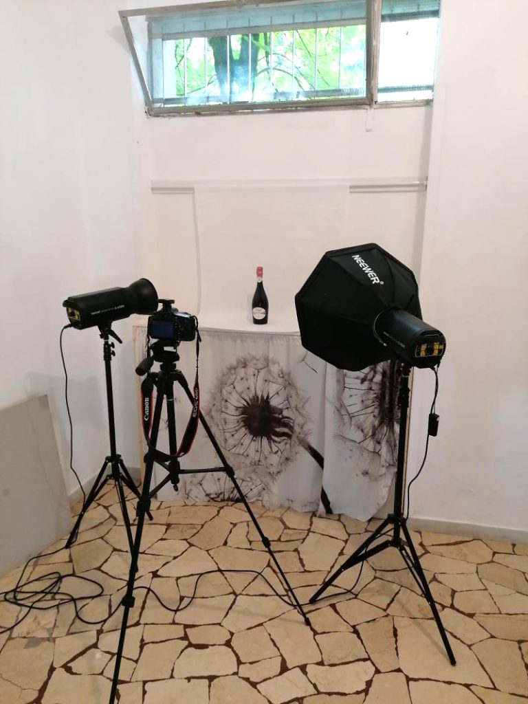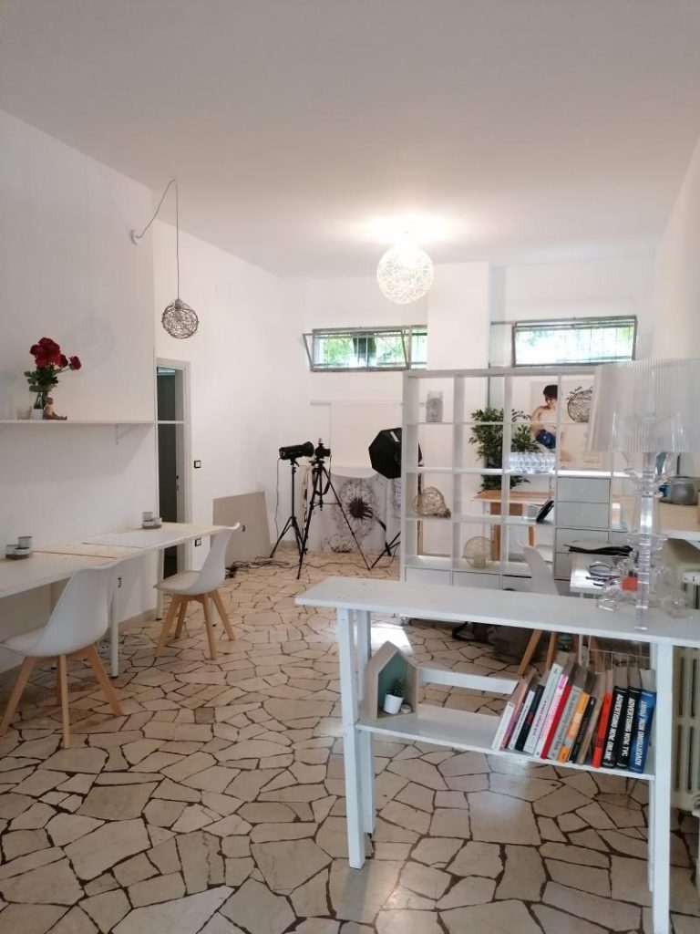Zona shooting fotografico attrezzata con fondale bianco, luci flash e spazio per realizzare scatti tecnici o still life.